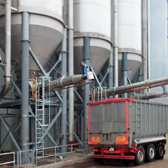 The dispenser attached to the silo is used for controlled, fast and clean feeding of a transport vehicle with wet spent grains.